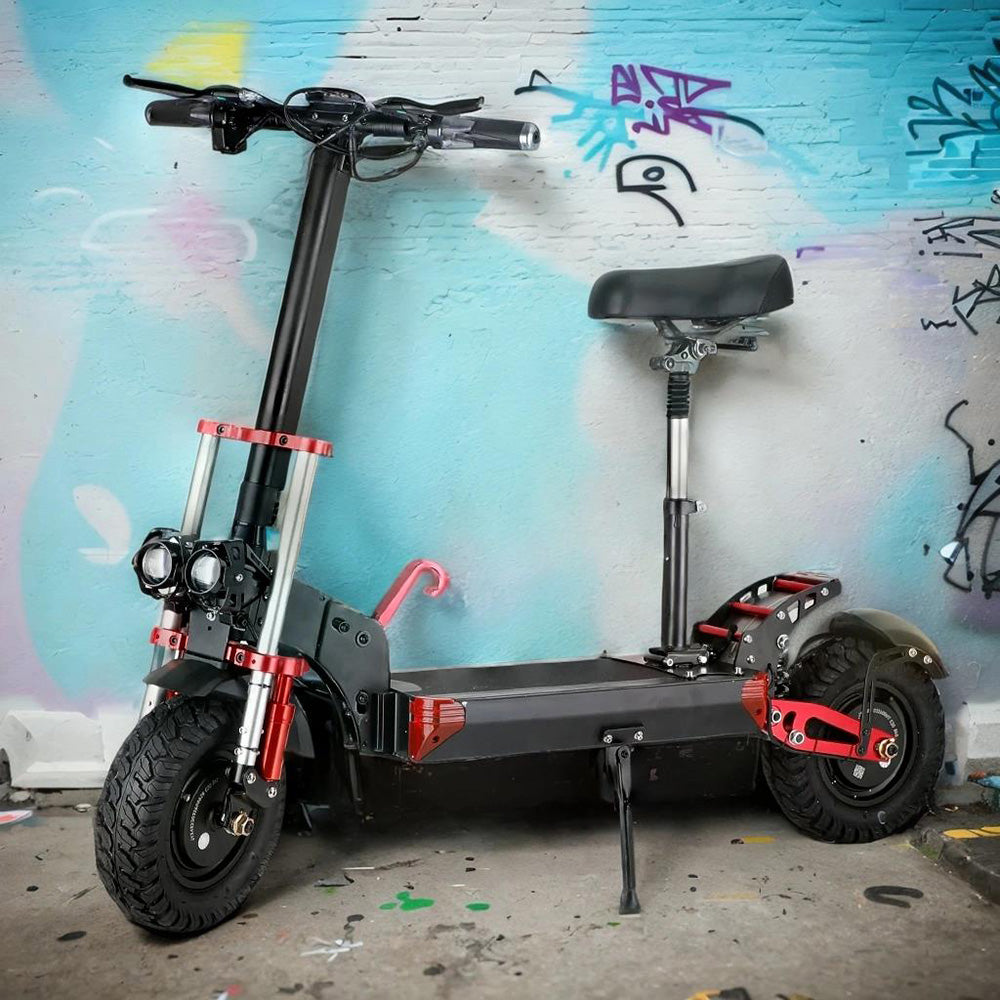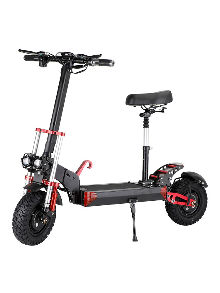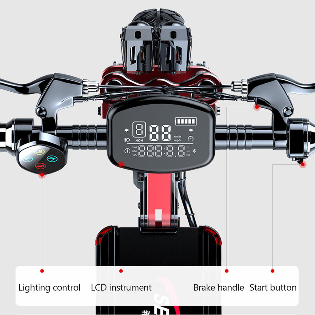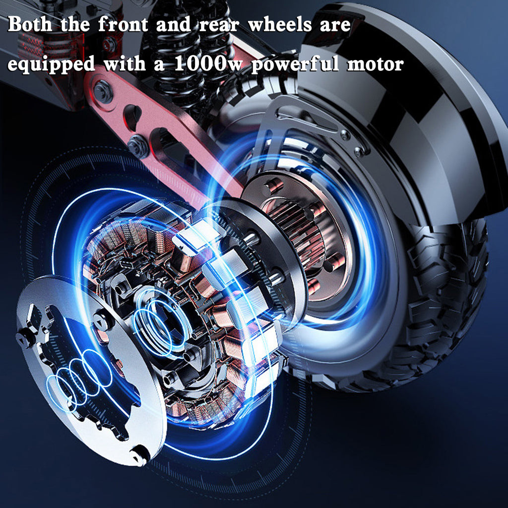 MotorGenic Unisex electric scooter is equipped with 2000W Motor (Front and rear drive motors both 1000W) and 48V 21AH Lithium battery,Provide a powerful travel experience. The maximum speed can reach 40MPH, and the longest driving distance is 80KM. The materials used are top of the industry, and the frame is made of aluminum alloy. In addition, the scooter has many features, Dual motor violent acceleration mode, NFC card induction start, turn signal function, etc..The weight of the whole body is 41kg,Let you not feel shaking during riding, enough to deal with any road conditions.The Red and black color matching is classic and fashionable