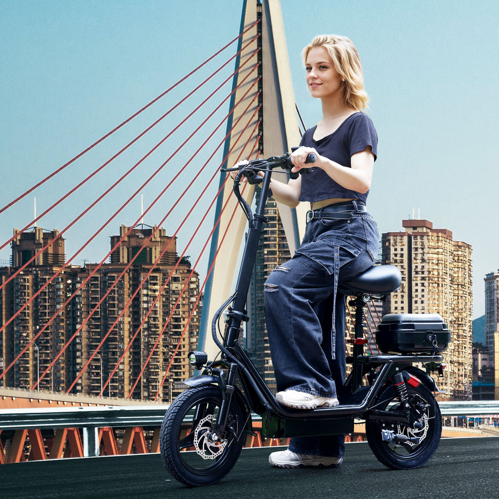 The scooter has a front drum brake and a rear disc brake system for reliable and efficient braking. 14-inch tires with a unique circular design provide excellent grip and stability even on rough terrain. At the same time, because of the foldable structure, it is easy to store and transport, which is very suitable for those who have limited space or those who need to go to work.