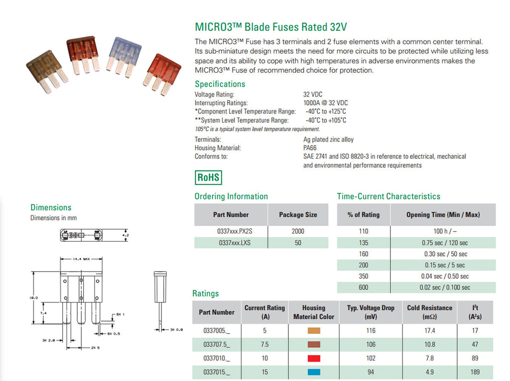 2. Its sub-miniature design meets the need for more circuits to be protected while utilizing less space and its ability to cope with high temperatures in adverse environments make the Micro3 Fuse of recommended choice for protection.