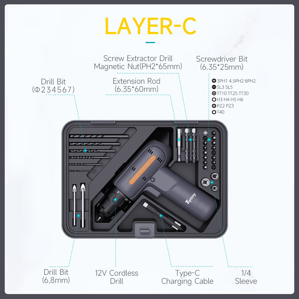 【Power Tools Combo Kit With 12V Cordless Drill】 64 pcs Tool Kit Box Set of AC features a 12V power drill driver with 17+1 speed adjustable that can drill into wood, metal or plastic for a variety of home projects. Max torque 20N·m for high (0-1500 r/min) or low (0-400 r/min) drilling/driving speeds. Keyless chuck offers automatic spindle lock for one-handed changing with excellent accessory compatibilities of drill/screwdriver bits of a diameter from 0.8~10 mm. Forward/reverse switch allows you to quickly tighten or change/remove bits as needed. Drills, bits and socket collection of 28 pcs included.